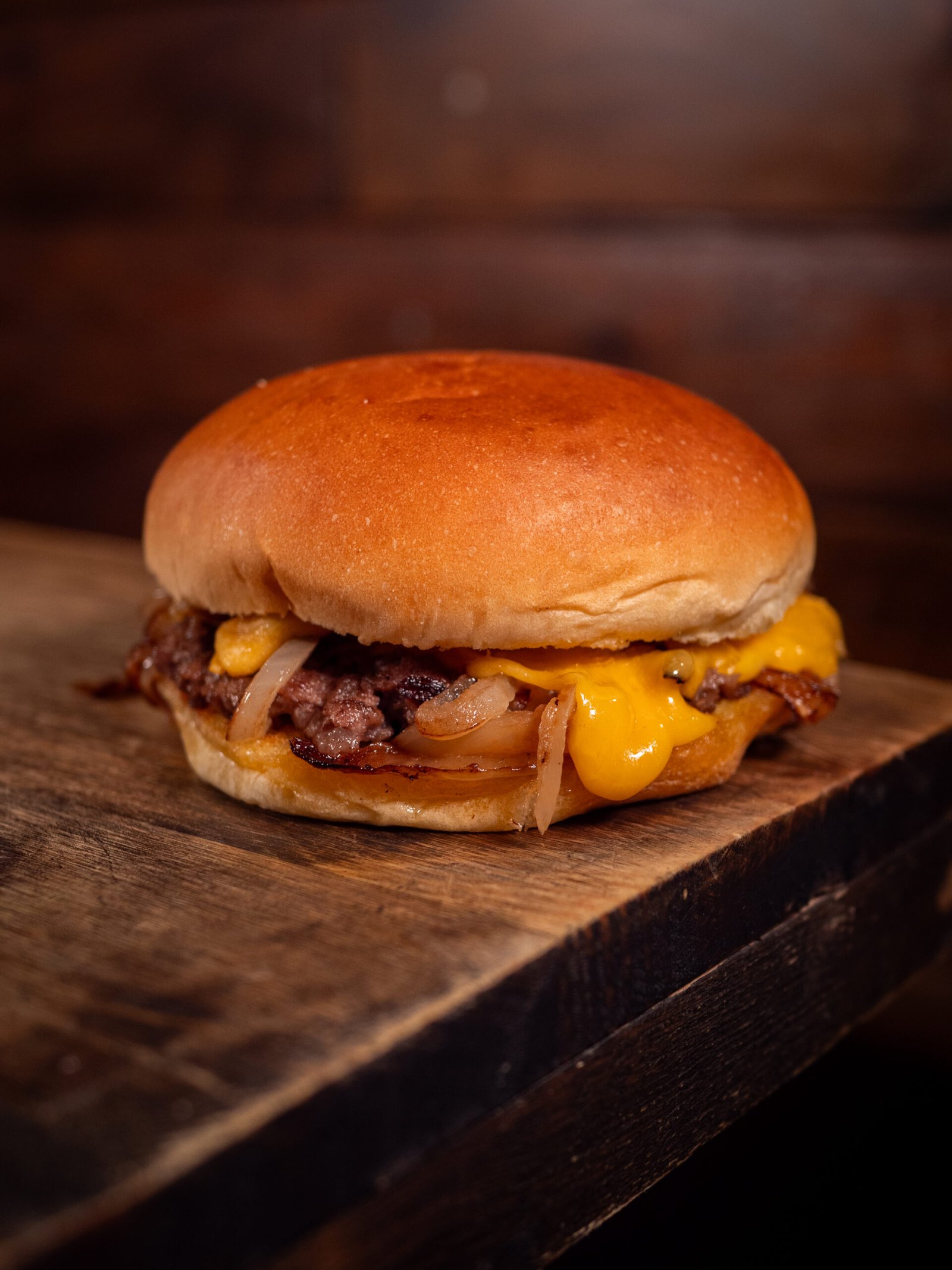 Pão brioche, 100% novilho (80gr), queijo cheddar, cebola